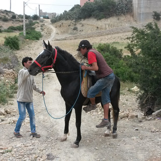Nous lui mettons une selle, une bride avec mors simple et nous sortons dans le village. "Bismillah" dit Brahim en mettant le pied à l'étrier, et hop, le voilà sur son dos. Sans aucune autre manipulation ni préparation à pied du cheval et surtout sans aucune crainte ni pensée négative. L'assurance de Brahim m'impressionne.