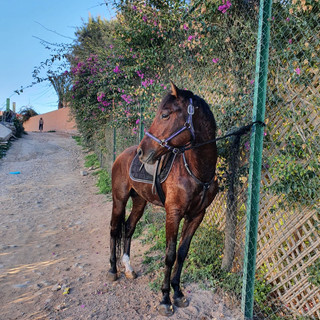Alice : " Les chevaux ont été exemplaires aujourd'hui ! Peut-être la plage leur a permis de se défouler ? J'ai monté Saphir, c'est un agréable retour sur son dos. J'avais un peu bataillé avec lui la première fois, en pelham, et subit les coups de dos lors des allures. Cette fois-ci il était en mors simple et je sens qu'il nous remercie de l'avoir compris ! Il est derrière son copain Mistral, super sage, pas de rodéo lors des départs au trot et au galop, je savoure ! On a ensuite redescendu tout le chemin qui serpente dans la montagne, en trotting, ils étaient tous adorables et ça leur a fait faire une bonne séance de sport 💪🏽 retour par les palmiers et l'oued, on est trop fan de la lumière du soleil couchant au loin, et on rentre à l'écurie pile à la nuit tombée ! 🌝 "